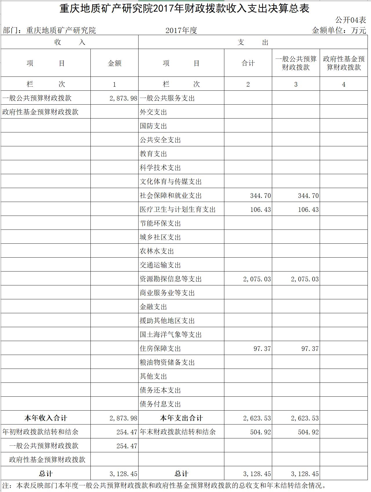 本部门2017年度财政拨款收入2,873.98万元,较上年决算数减少65.07万元,下降2.21%。其中:因2017年机关事业单位养老保险改革,我院退休人员养老保险由社保基金统一发放,不再纳入部门决算口径,使得2017年社会保障和就业财政拨款收入较2016年决算数减少452.20万元;因人员变动和国家薪酬调整,2017年医疗卫生与计划生育财政拨款收入较2016年决算数增加22.81万元,2017年住房公积金财政拨款收入较2016年决算数增加10.40万元;因实验室设备购置支出和人员薪酬变化,使得2017年资源勘探信息财政拨款收入较2016年决算数增加353.92万元。本部门2017年度财政拨款收入2,873.98万元,较年初预算数减少613.76万元,下降17.60%。其中,因2017年机关事业单位养老保险改革,我院退休人员养老保险由社保基金统一发放,2017年社会保障和就业财政拨款收入较年初预算数减少566.04万元;因人员变动和国家薪酬调整,2017年医疗卫生与计划生育财政拨款收入较年初预算数增加0.73万元,2017年住房公积金财政拨款收入较年初预算数增加0.56万元;因实验室设备购置支出和人员薪酬变化,使得2017年资源勘探信息财政拨款收入较年初预算数减少49.01万元。