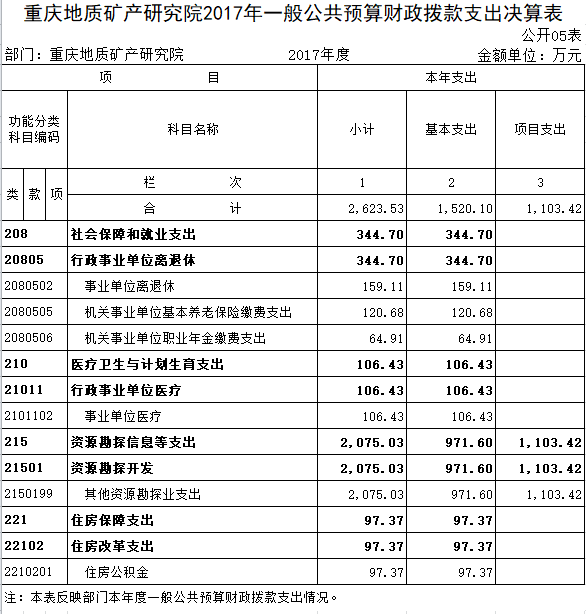 本部门2017年度财政拨款支出2,623.53万元,较上年决算数减少427.17万元,下降14.00%。主要原因是2017年我院退休人员养老保险由社保基金统一发放,不再纳入部门决算口径,使社会保障和就业支出较上年决算数减少452.20万元;因人员变动和国家薪酬调整,2017年医疗卫生与计划生育支出较上年决算数增加22.81万元,2017年住房保障支出较上年决算数增加10.40万元;因实验室设备购置支出和人员薪酬变化,2017年资源勘探信息等支出较上年决算数减少8.18万元。本部门2017年度财政拨款支出2,623.53万元,较年初预算数减少864.21万元,下降24.78%。其中,因2017年我院退休人员养老保险由社保基金统一发放,使社会保障和就业支出较年初预算数减少566.04万元;因人员变动和国家薪酬调整,2017年医疗卫生与计划生育支出较年初预算数增加0.73万元,2017年住房保障支出较年初预算数增加0.56万元;因实验室设备购置支出和人员薪酬变化,2017年资源勘探信息等支出较年初预算数减少299.46万元。