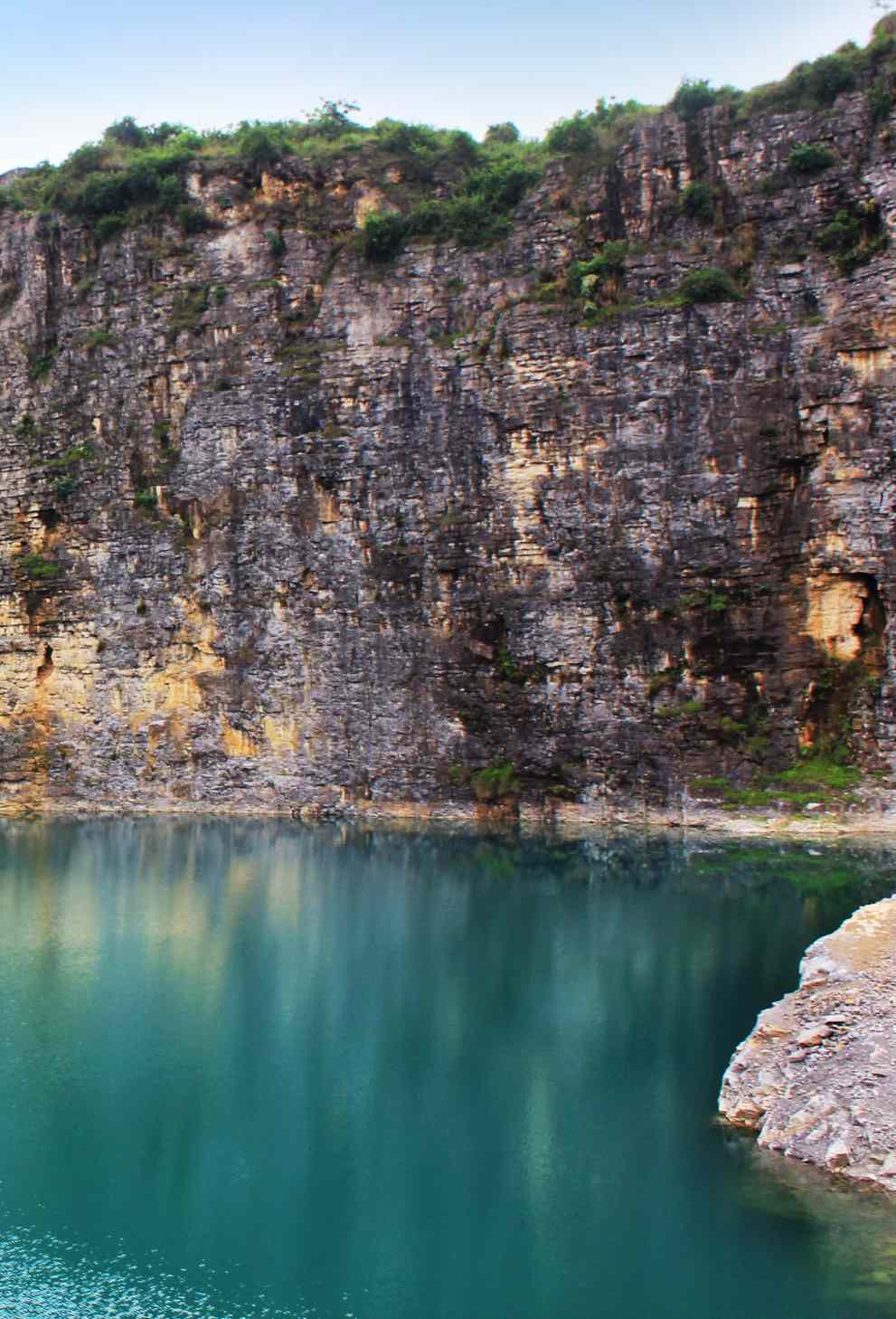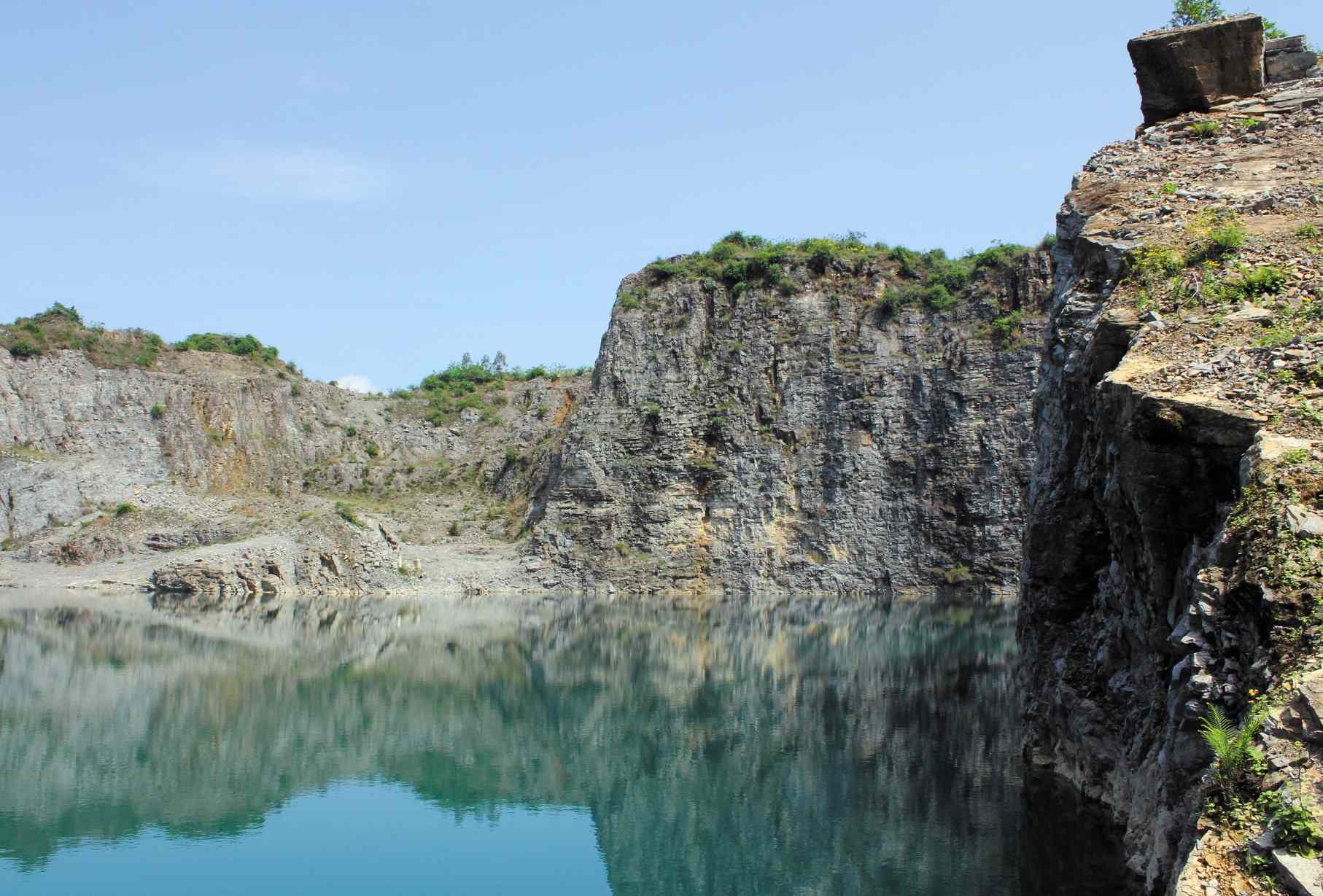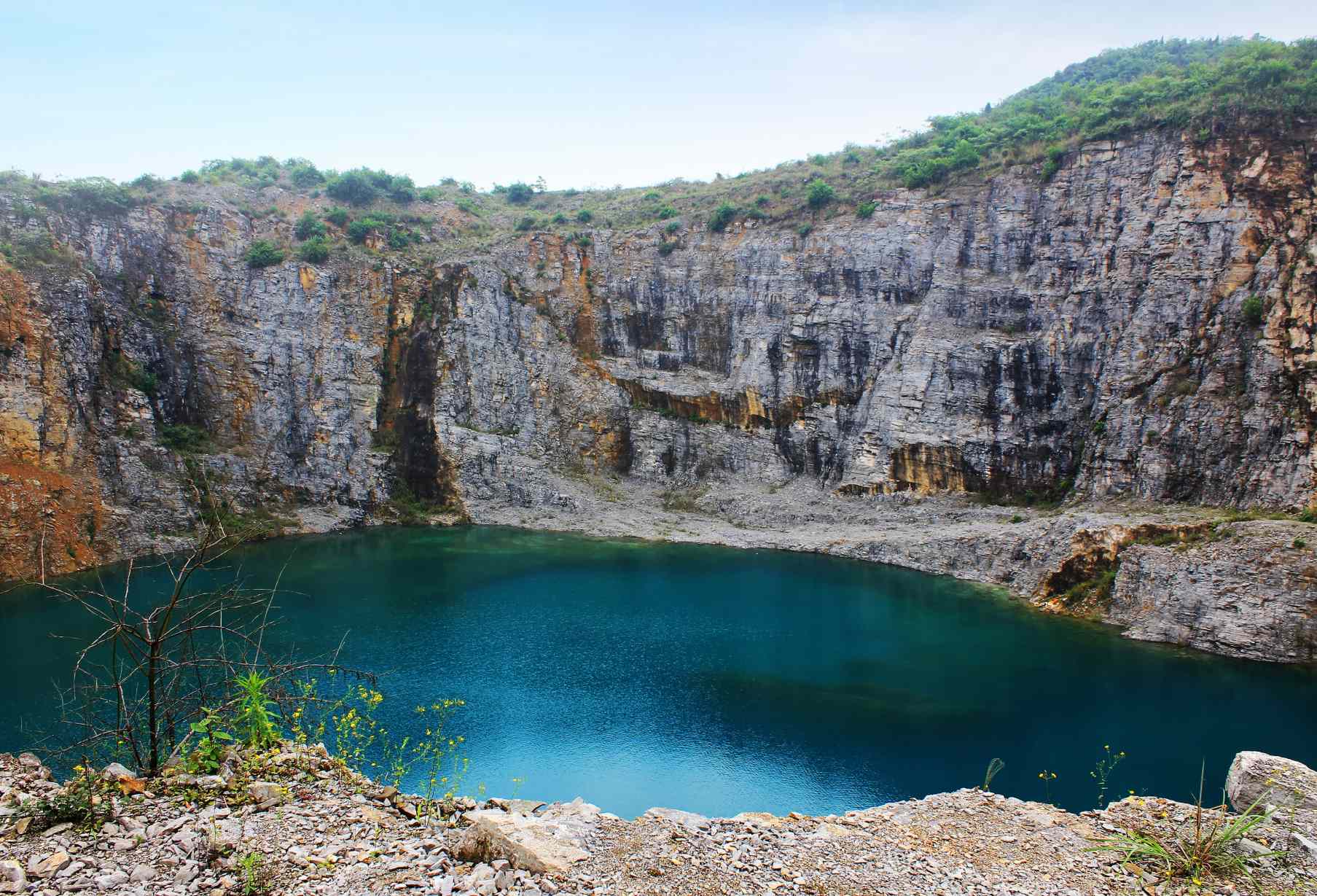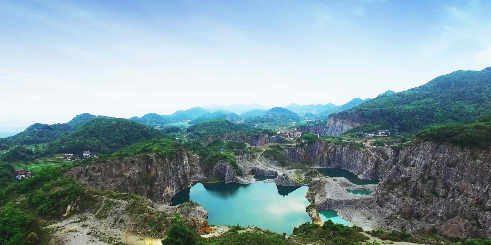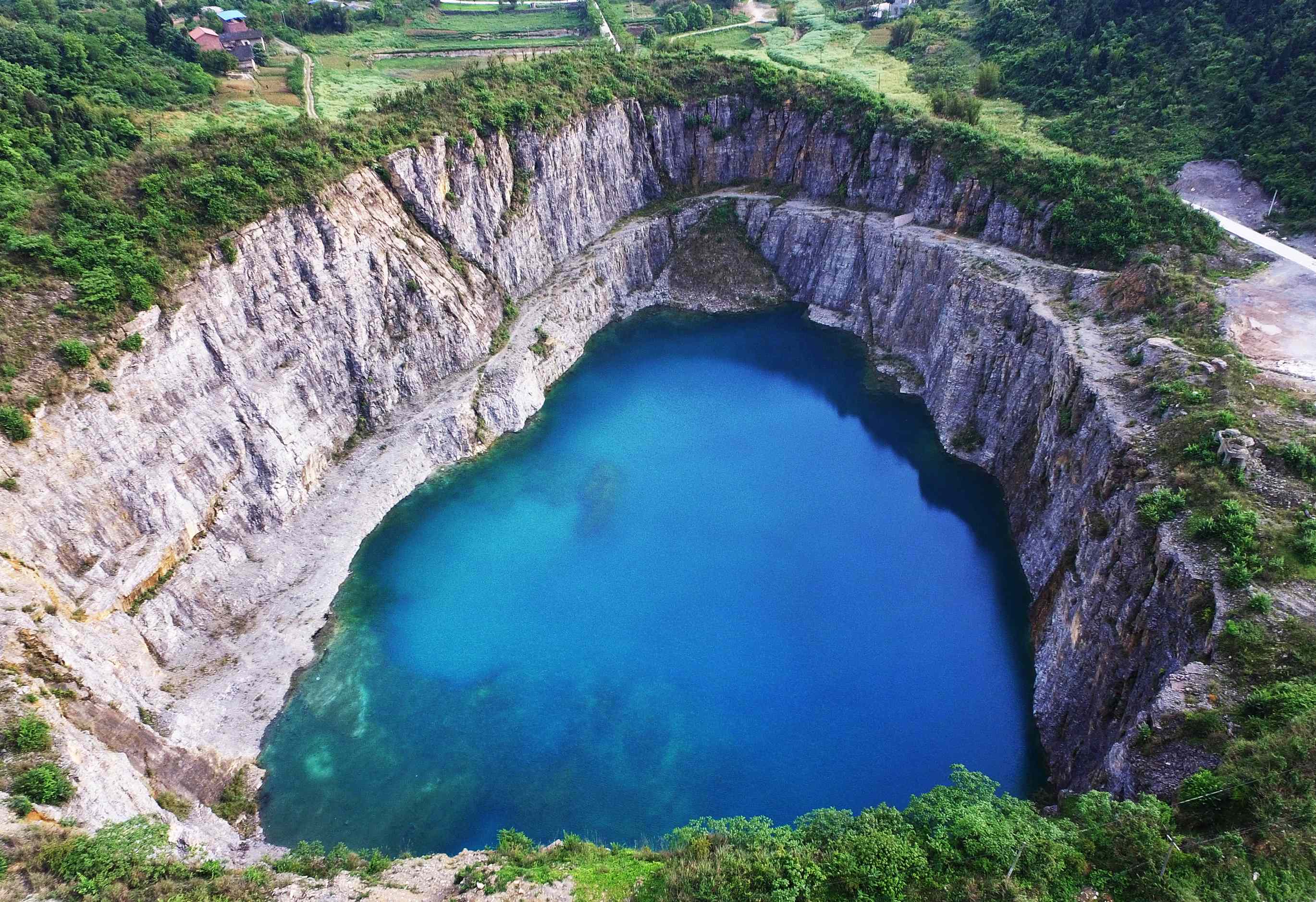 重庆渝北铜锣山国家矿山公园位于渝北区东北部石船镇,公园面积24.15km2,矿坑41个,平面总面积约2.47平方公里,南北绵延10公里。矿坑内湖水终年碧蓝澄澈,明丽见底,并且随着光照变化、季节推移,呈现不同的色调与水韵,在国内同类矿山中具有极高的稀有性,属世界少有或国内罕见的遗迹,具有较高的科普和观赏价值。矿坑水体颜色的光学基础来自其岩溶地质背景和良好的生态环境,在此基础上产生光线的选择吸收。由于水体清澈,光线入射深度较大,水体对蓝、绿光之外的其他色光产生了强烈的选择性吸收,故形成了独特的水体颜色的光学基础,辅以其他因素如钙华、藻类底质等形成绚丽的光彩。